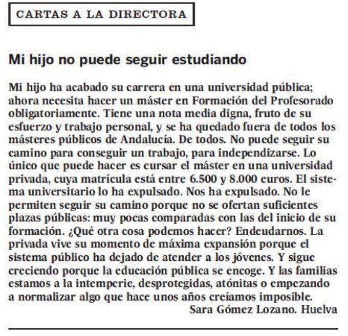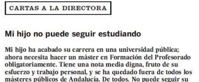 ¿Recordáis que, en el mes de septiembre, se hizo viral una Carta a la Directora en El País, de Sara, una madre que veía con preocupación el futuro de su hijo? En dicha publicación, Sara manifestaba su frustración al ver como su hijo, un buen estudiante, no podía seguir avanzando en su desarrollo educativo y laboral por la falta de plazas en las universidades públicas andaluzas en el máster que necesita para habilitarle como profesor de secundaria en su rama, Ciencias de Actividades Físicas y Deportivas.