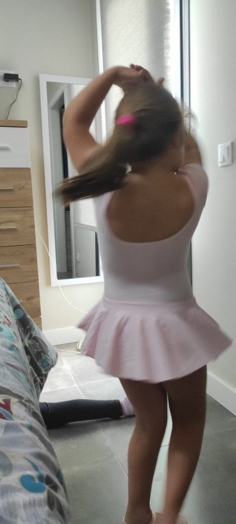 Había niñas sentadas a un lado y otras, de pie, pegadas a la pared con la profesora. Estaban haciendo un ejercicio que consistía en que una niña, situada en el centro de la clase, elegía a otra, de las que quedaban de pie. La primera hacía una pirueta para que la otra la repitiera y acababan en un abrazo. La primera se sentaba y la segunda volvía a empezar, ya situada en el centro, eligiendo a una de las que quedaban, haciendo la pirueta para que la repitiera la segunda, se abrazaban y volvía a empezar.